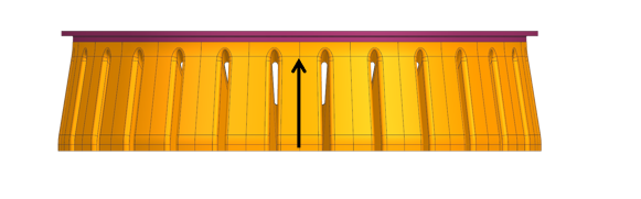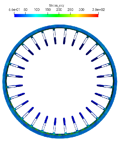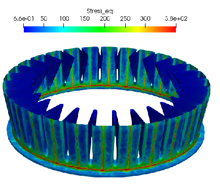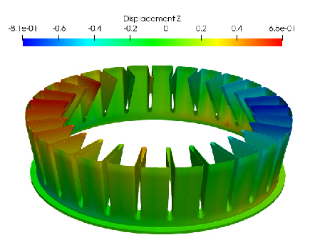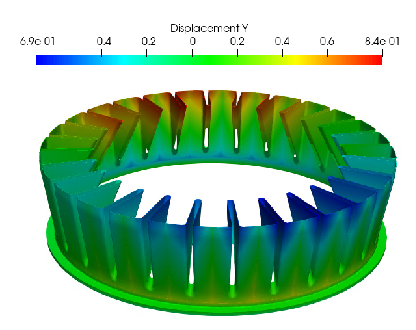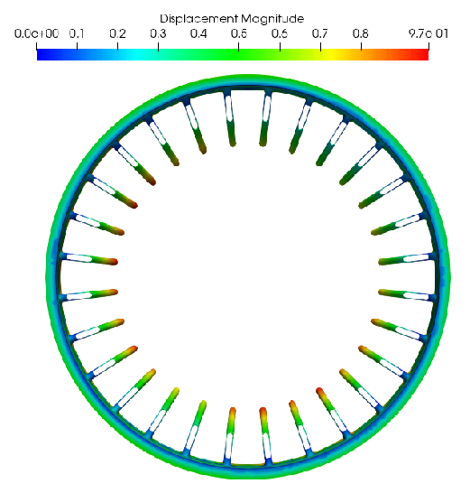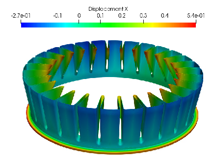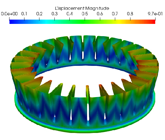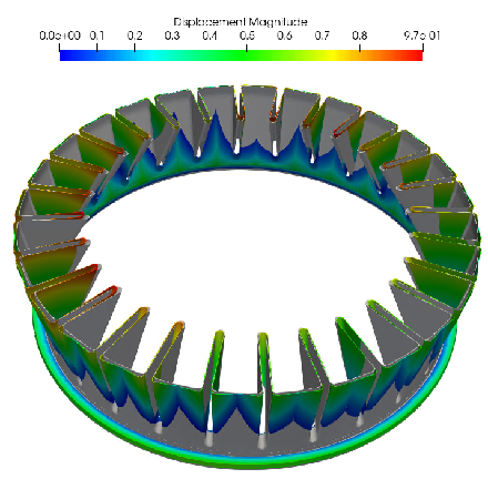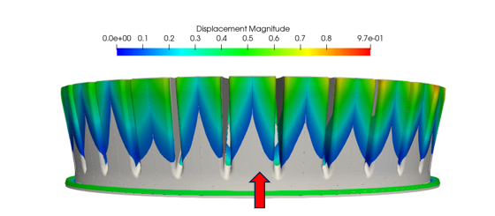 变形分析: 最大变形主要集中在结构件附近波浪状部