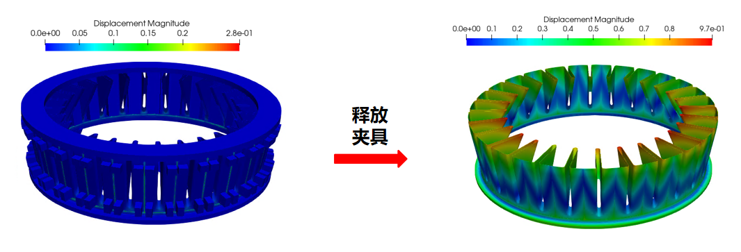有夹具约束变形较小,释放夹具后由于残余应力冷却后发生塑性变形,从而释放应力